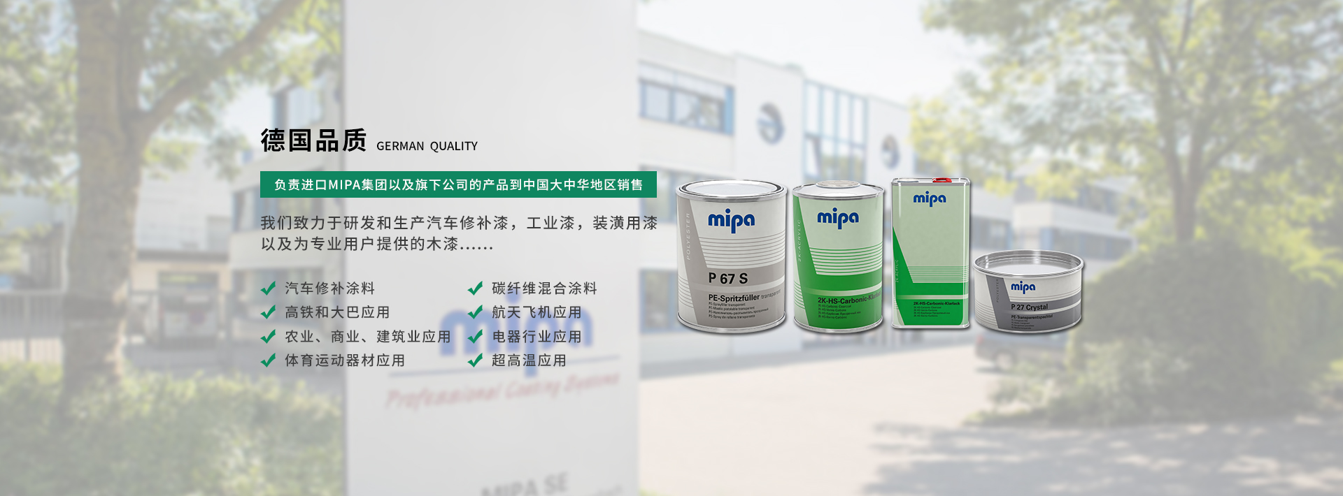 米帕(深圳)涂料有限公司 米帕(深圳)涂料有限公司是MIPA SE的中國分公司,成立于2013年,目前公司位于深圳市龍崗區,主要負責進口MIPA集團的產品到中國大陸銷售。MIPA集團總部坐落于德國艾森巴赫,是一家快速發展的中型企業,主要生產各類清漆和油漆。我們在德國以及境外擁有超過8個以上的生產基地,我們致力于研發和生產汽車修補漆,工業漆,裝潢用漆,以及為專業用戶提供的木漆。Mipa 集團目前全球員工人數已超過1200名,我們的員工正在為全球各大洲超過100多個國家的子公司和客戶群體運送產品。